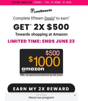 Description: Complete fifteen Deals1 to earn* Get* 2X $500 Towards shopping at Amazon Requirements: Answer quick questionnaire and sign up Allowed Methods of Promotion: Display, Email,Path Display, Push, Search, Social Media Restriction ...