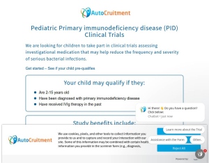 Description Clinical Research Commission upon submission of qualified lead (see lead details/qualifiers and disqualifiers) Qualifications: -Ages 2-15 -Diagnosed with primary immunodeficiency disease -Diagnosed by a doctor with any of the following c ...