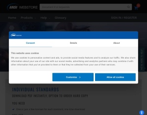 The American National Standards Institute - ANSI - facilitates and corrdinates the U.S. voluntary standards and conformity assessment system. The ANSI Webstore is an online electronic standards web-based ordering and delivery system for U.S. and inte ...