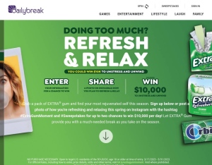 Let EXTRA® Gum provide you with a much-needed break!! Flow: Sign up for Dailybreak, sign up below or post a photo of how you're refreshing and relaxing this spring on Instagram with the hashtag #ExtraGumMoment and #Sweepstakes for up to tw ...