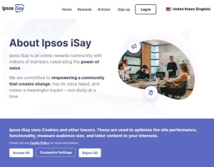 Description Ipsos iSay is an online research community where members can influence the future of brands, governments, and societies and get rewarded. Our members can discover their influence in research articles, news stories, new products, ads or T ...