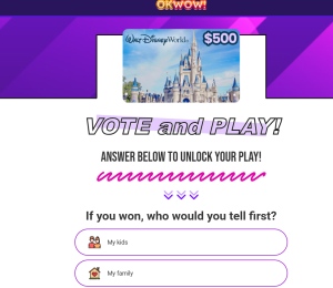Description: Okwow Smallprize-Walt Disney World $500 Requirements: Converts on a valid leads Allowed Methods of Promotion: Display, Email, Native, Social, Search Restrictions: No Incent, No Adult, No Fraud, No Bot, No Content ...