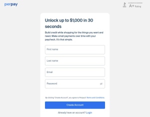 Unlock up to $1,000 in 30 seconds Build credit while shopping for the things you want and need. Make small payments over time with your paycheck. It's that simple. PerPay lets shoppers buy now and pay over time with automatic payroll deductions i ...