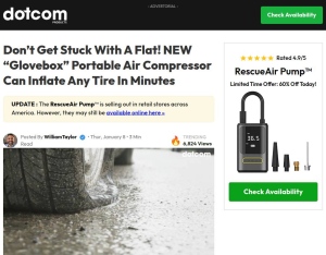 GEO: US Cap: 10/day Description Traffic allowed: EMAIL/DISPLAY *US TRAFFIC ONLY* Don’t Get Stuck With A Flat! NEW “Glovebox” Portable Air Compressor Can Inflate Any Tire In Minutes! Pays on valid one time purchase. ...