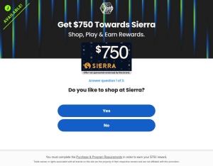 Conversion Requirements: Get $750 Towards Sierra Shop, Play & Earn Rewards. Answer quick questionnaire and sign up Allowed Traffic: Display, Email, Path Display, Push, Search, Social Media Restrictions: No Adult, No Fraud, Ages 18+ ...