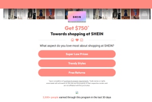 Description: Shein 750$ Requirements: User needs to answer 3 short question (yes/no) and fill up email field, postback fires Allowed Methods of Promotion: Email, Display, Pop, Push, Social, Native, SMS, Google, Contextual Res ...